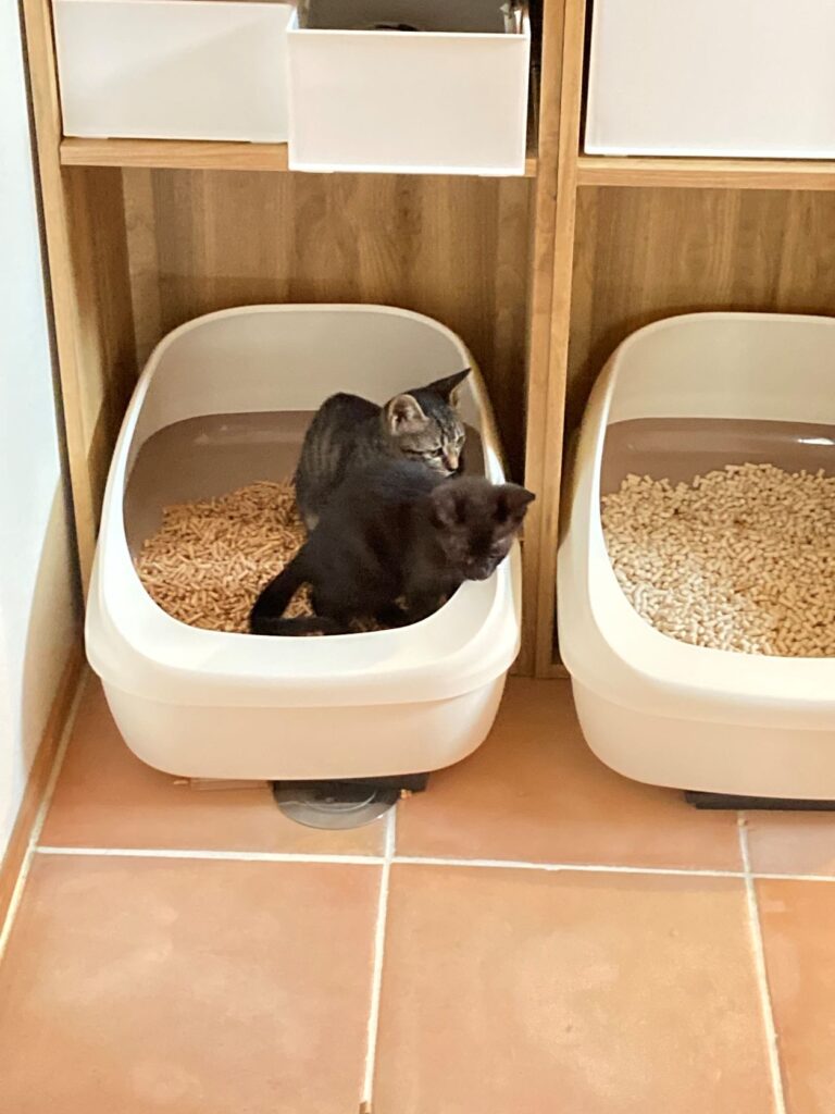 3ヶ月の頃,我が家にきたばかりのつむ&まる。迎えてすぐに「トイレはここだよ~」と案内して依頼,2匹ともちゃーんと失敗する事もなく,できています。